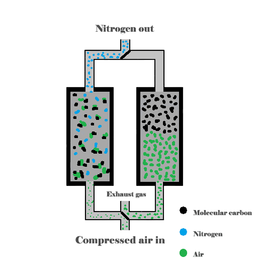 The pressure swing adsorption (PSA) process is based on that under high pressure; gases tend to be trapped onto solid surfaces (absorbed). The higher the pressure, the more gas is adsorbed. When the pressure is dropped, the gas is released, or desorbed. PSA can be used to separate gases in a mixture because different gases are adsorbed onto a given solid surface more or less strongly. For example, if a gas mixture such as compressed air is passed under pressure through a vessel containing an adsorbent bed of molecular carbon that attracts oxygen more strongly than nitrogen, the oxygen with stay on the absorbent bed and the existing gas released will be more richer in nitrogen than oxygen. When the bed reaches the limit of its capacity to adsorb oxygen, it can be regenerated by decreasing the pressure, thus releasing the adsorbed oxygen. It is then ready for another cycle of producing nitrogen from the incoming air.